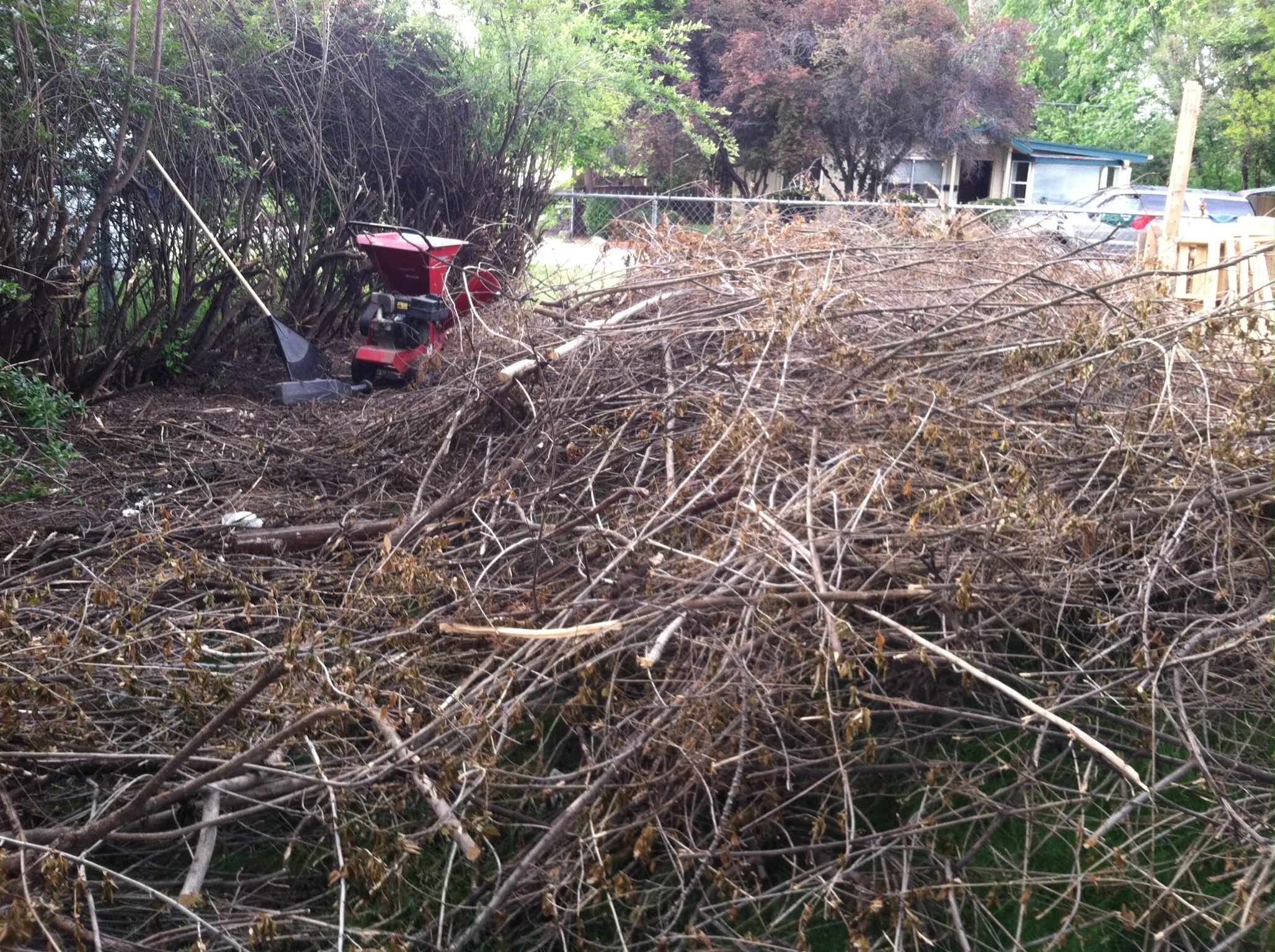 Earlier in the week, my aforementioned neighbors and another friend helped me haul our neighborhood-owned wood chipper over and park it out back. It sat there until Thursday, when I finally had a free evening to get to work and start turning some brush into mulch. I was proud of myself initially for actually getting the thing started (it only took three tries…), and then I was humbled by the sheer volume of organic matter that was facing the chipper. Here’s a good picture that puts into perspective what a daunting task I am facing:
